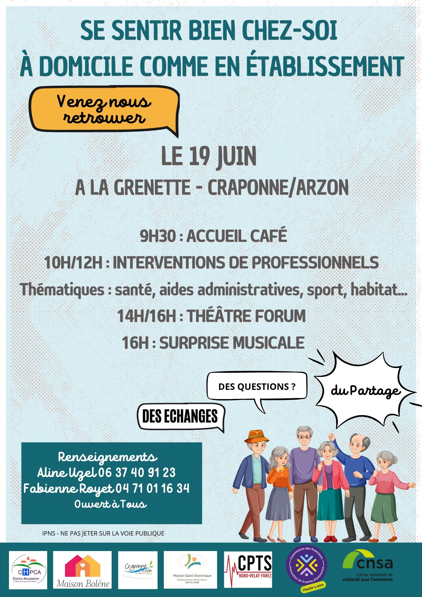 Le 19 juin prochain, rejoignez-nous à La Grenette, à Craponne-sur-Arzon, pour une journée placée sous le signe du bien-être, de l’information et de la convivialité ! Cet événement, ouvert à tous, a pour objectif de favoriser le bien-vivre des personnes âgées, qu’elles résident à domicile ou en établissement.